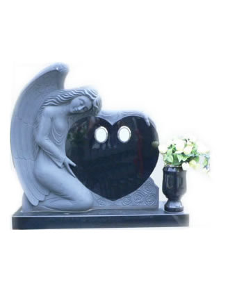 Cabecero del ángel abrazando corazón en dos colores, negro intenso con dos portafotos y gris, Asentado en peana de 8 centímetros. Jarrón de copa redondo en color negro intenso.