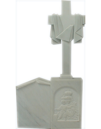 Cruz doble en color blanco macael. Imagen en relieve de la Virgen del Carmen Brazo con manto del sudario.